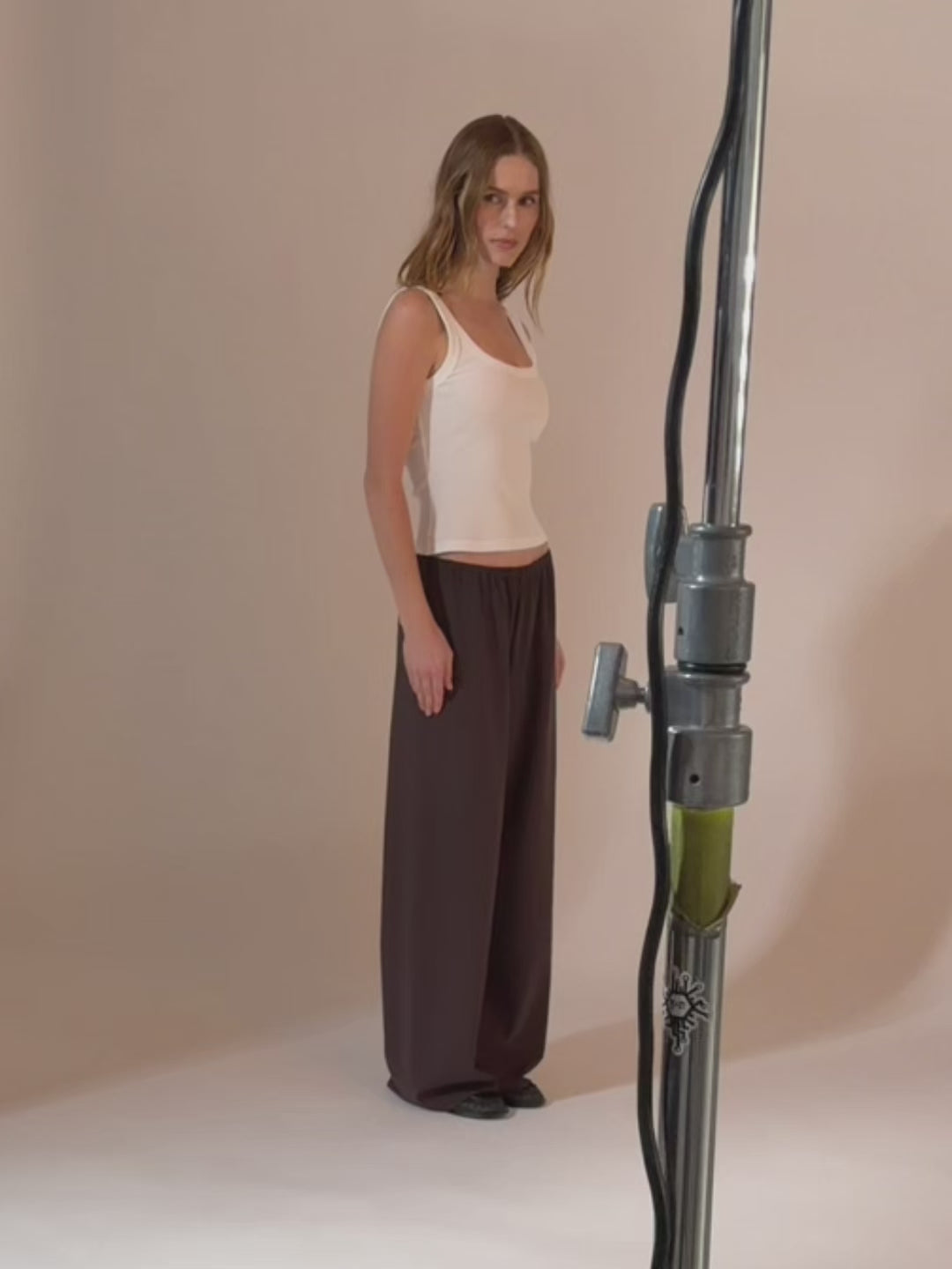 an easy every day pant with an elastic waistband and a wide leg. the pant is made with a drapey light-weight twill and cut on the bias for a flattering drape.